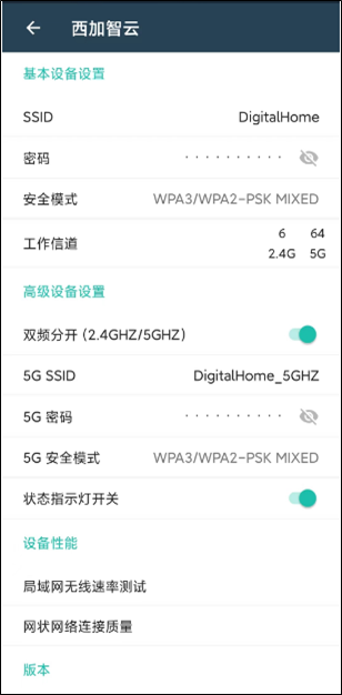 进入到APP主界面——点击西加智云左侧图标——WIFI配置界面,用户根据自身需求设置无线名称、无线密码和双频网络的设置;用户同时还可以通过该模块功能进行网络测速、查看网络连接质量和固件版本的升级。详情如下所示: