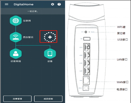 当用户需要布置多台西加智云系列设备时,可通过APP主界面添加多台设备,设备添加完成后,同时按下设备的WPS键5秒左右,当设备无线状态灯变为绿灯闪烁后松开,两台路由器之间即开始Mesh组网配对。详情如下所示: