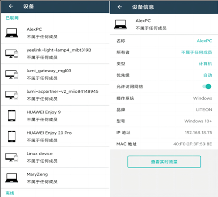 设备管理功能主要是查看在线、离线设备、设备信息、设备实时流量和设备活跃应用流量的情况,同时还可以对在线设备进行标识和设置相关权限。