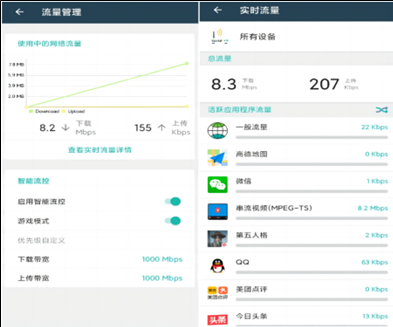 流量管理功能为客户提供网络流量实时查看和活跃应用流量实时查看,同时可以结合智能流控功能,对网络上下行带宽进行设置,保障网络的流畅。