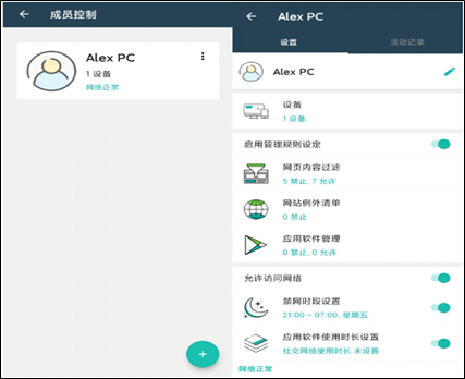 成员控制功能:针对连接至西加智云的终端设备进行管控,可对不同成员进行个性化设置,可对设备进行网页内容过滤(黄赌毒等),网站例外清单设置、应用软件管理设置、上网时间段切片话个性设置、应用软件上网时长设置、查看管控设备网络活动记录。